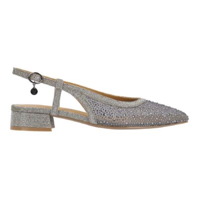 This mesh/fabric/rhinestones pump has a square toe, memory foam+latex insole, synthetic lining and synthetic outsole. This style also features a buckle closure on a 1 inch heel.